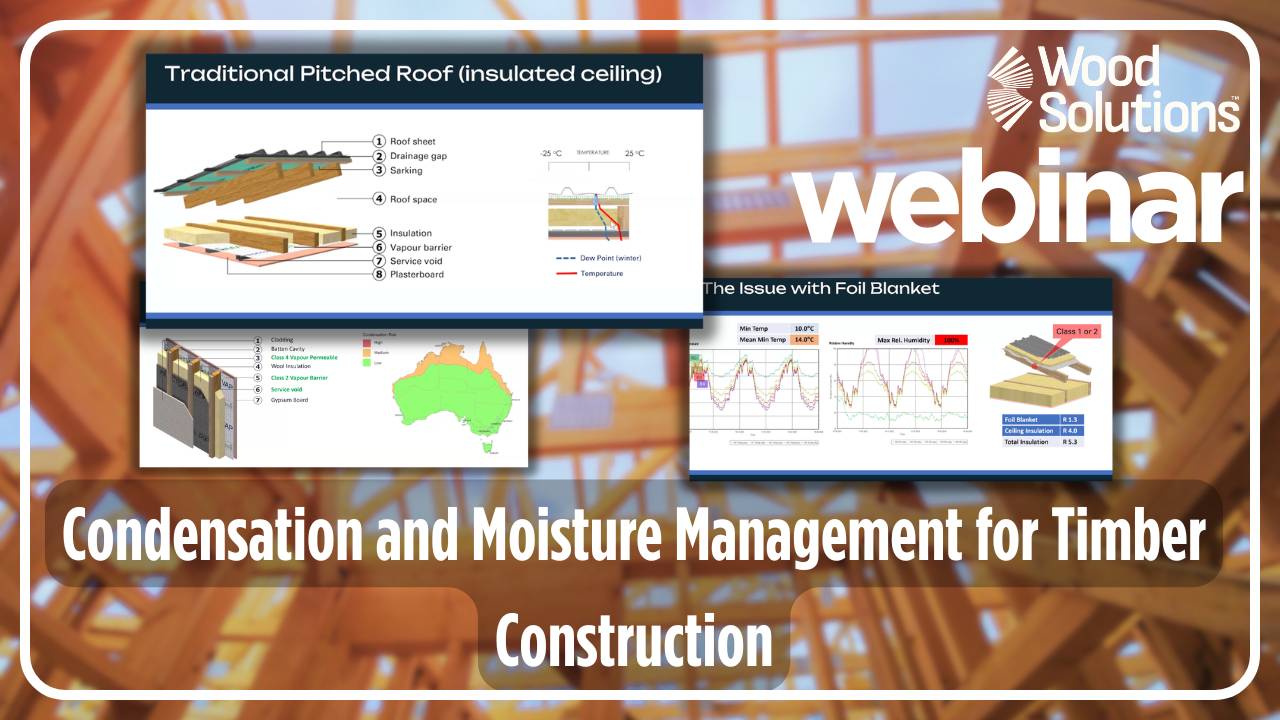 This webinar will also officially launches the new Forest & Wood Products Industry Standard “D01 Design and Installation of Exterior Wall Cladding” and the "WoodSolutions Technical Design Guide #57 Condensation Management in Timber Construction".