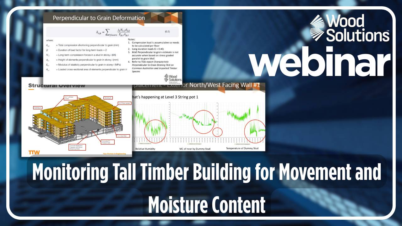 The performance of mid-rise timber buildings is new to Australia, and assumptions on moisture content, movement are based on small scale buildings. The research was carried out on an actual six-storey timber-framed apartment building, located in western Sydney, during its construction and occupation, to test these assumptions.