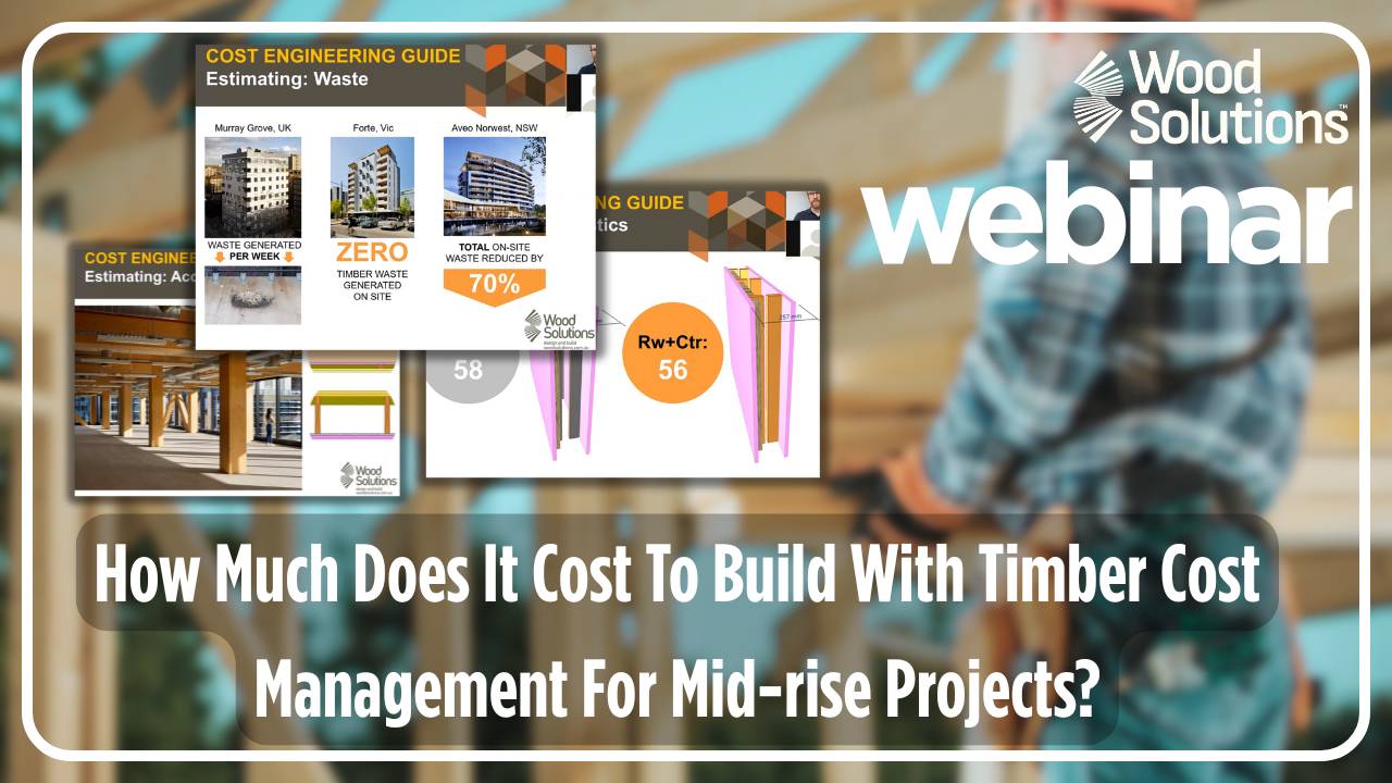 This webinar provides an introduction to the products and systems typically used in the delivery of major timber structures. It will present the recently launched WoodSolutions Cost Engineering Guide (completed in partnership with RLB), and will briefly touch on topics including fire protection, durability, acoustics, the supply chain, and project financing.